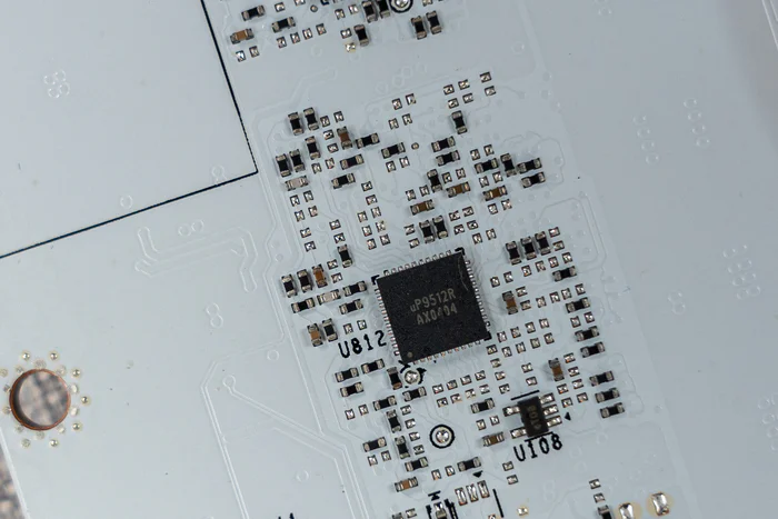 PCB背面的供电,核心PWM是uPI uP9512U,显存PWM是uPI uP9512R,中间这颗安森美NCP45491则用于电源监控