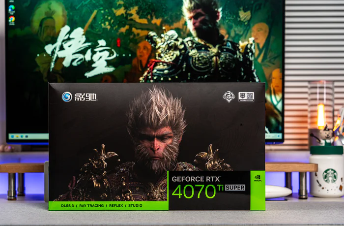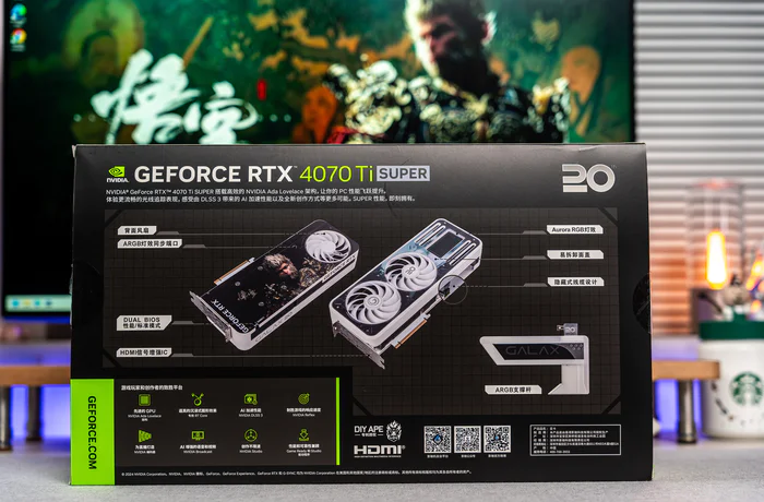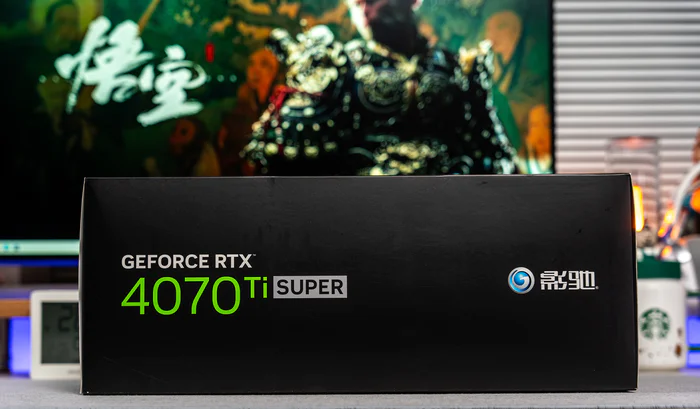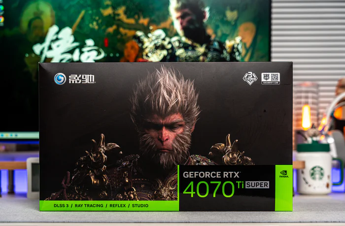 黑神话:悟空的横空出世,积攒了几年的国人3A典范终于如期而至,当然如期而至的还有各家的黑神话:悟空定制版显卡,可以说各家都有,毕竟每个厂家都想借力一波,而英伟达也是在引擎上对DLSS3和帧生成等诸多功能作了最大的优化,这几天体验下来,哪怕低端的1070级别的显卡开个最底特效也能跑4K的黑神话,不过也只是能玩,要想体验完整的特效那依然是比较高阶显卡的,体验过最底特效和影视级开光追,真的是天差地别的两个游戏。好了,今天要开箱的是来自影驰黑神话:悟空版本的RTX 4070 Ti SUPER特别纪念版显卡,虽然是特别纪念版,但它骨子里就是影驰的20周年纪念版,这款散热相当优秀,各方面都比较给力,特别是其能隐藏供电设计,可以说是专门为背插的无线设计。