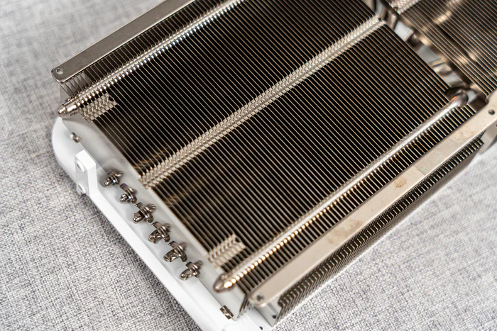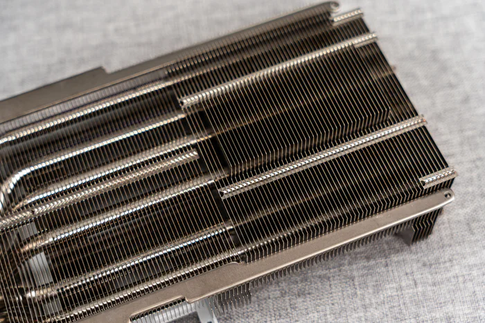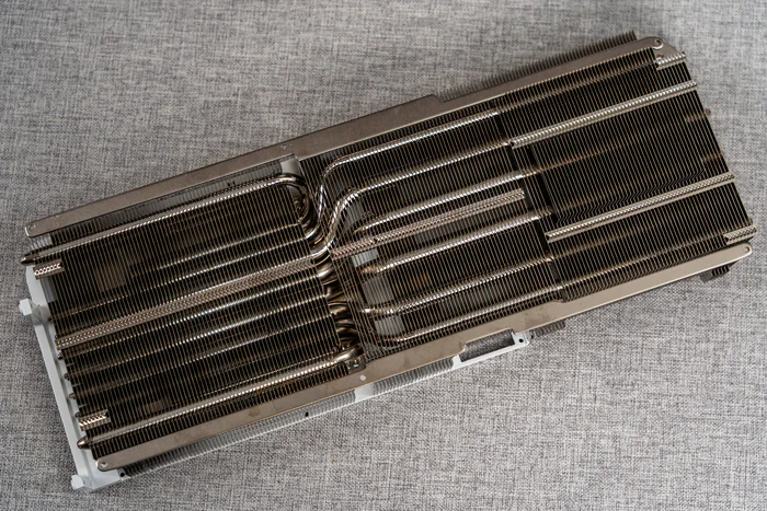 散热本体的正面,相当规整,上下两侧有固定防止散热鳍片变形,除了中间的热管弯折处少了几片鳍片