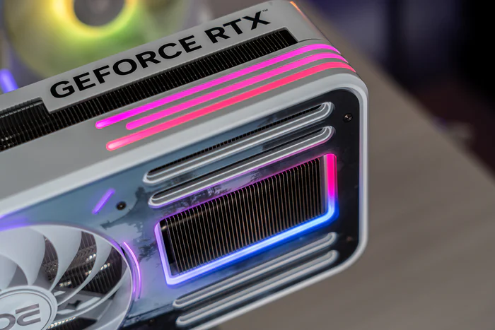 显卡的顶部末端一侧是带有ARGB效果的三条灯带,上面还有背板包裹的GEFORCE RTX的logo