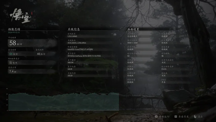另外还有一种说法需要关闭帧生成,我也测试了在关闭帧生成、关闭光追、使用50%超采样清晰度的DLSS下,在影视级特效的4K分辨率下测试平均帧率58FPS,也是非常流畅的