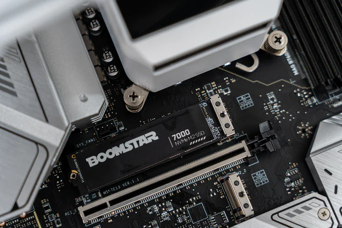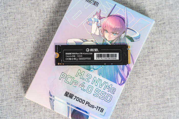 测试使用的固态硬盘是来自影驰的主流PCIe 4.0 SSD:星曜7000 Plus SSD。它的产品标称顺序读写速度就分别达到了7000MB/s、6000MB/s,就如同它的名字一样。其主控为群联PS5027-E27T,并且采用的TLC颗粒