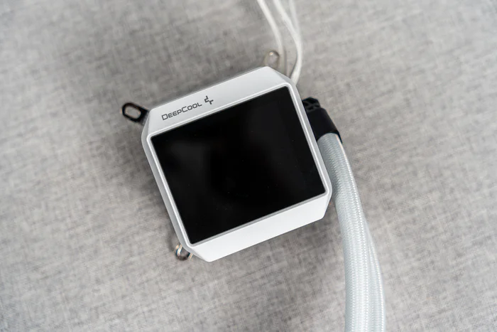 冷头的本体尺寸为93*77*66mm,顶部具有DEEPCOOL的logo,中间2.8英寸1670万色真彩LCD数显屏幕,分辨率达640*480,而且内置陀螺仪可识别安装朝向并自动旋转,而屏幕显示配合自研的智能控制软件MYSTIQUE可设置多种模式,屏幕上下各有一条灯带也可在软件中设置灯效,不仅可以支持主板联动,还能根据屏显的GIF或者图片的边沿来进行自动调色。除了显示动图外也可以用数显方式展现各种如CPU占用率、CPU温度、显卡温度、风扇转速、水泵转速、各项电压等等,所以可玩性是非常多的