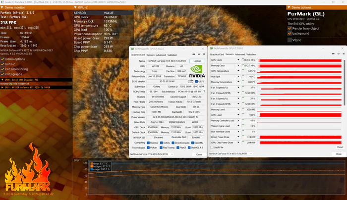 显卡的甜甜圈测试,测试10分钟之后所得最高温度GPU核心64.5°、GPU热点78.9°、显存66.0°,风扇只有1240RPM的37%,功耗有315W左右,相对于大核心的AD102来说相当凉快了,这也是得益于影驰的这款20周年散热器总成的效果,同时也非常静音