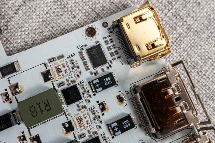 金色HDMI接左边的是一颗谱瑞科技的PS8419芯片,这颗芯片的作用是移除抖动,增强HDMI信号