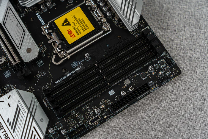 微星的DDR5 内存加速引擎Memory TRY IT !能使B760M迫击炮II超频速度支持高达7800+MHz,四条单边卡扣且中间有加固设计,主板背面也能看到SMT贴片工艺提升内存性能