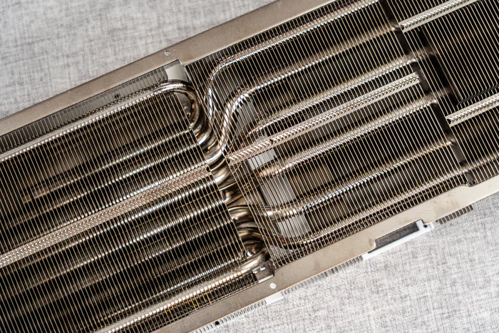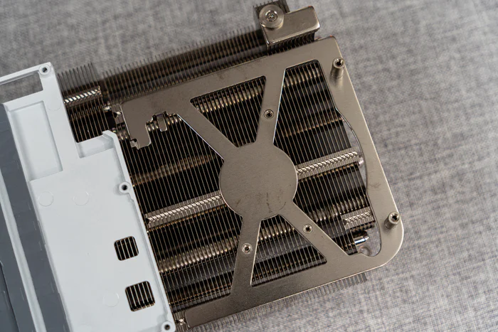 散热器挡板一侧可以看到依然有6根热管从均热板处延伸出来,另外顶部还有2根弯折的热管