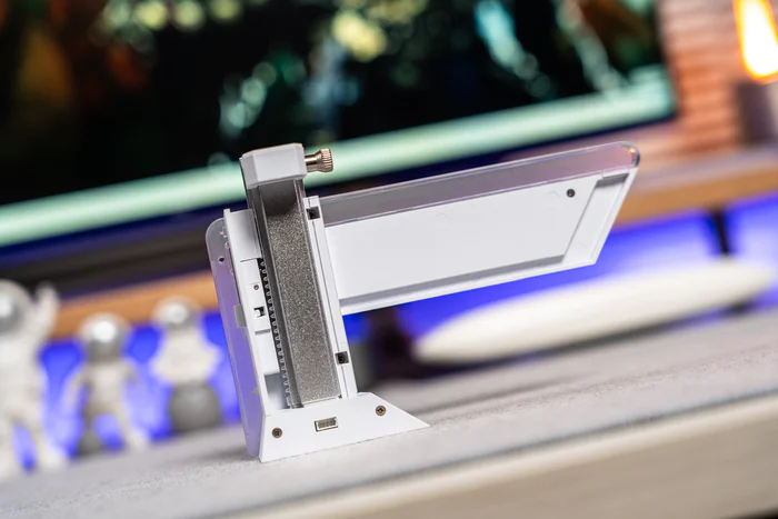 显卡支架不仅支持ARGB联动,还能通过背面的弹扣按下来达到调节高度的重要