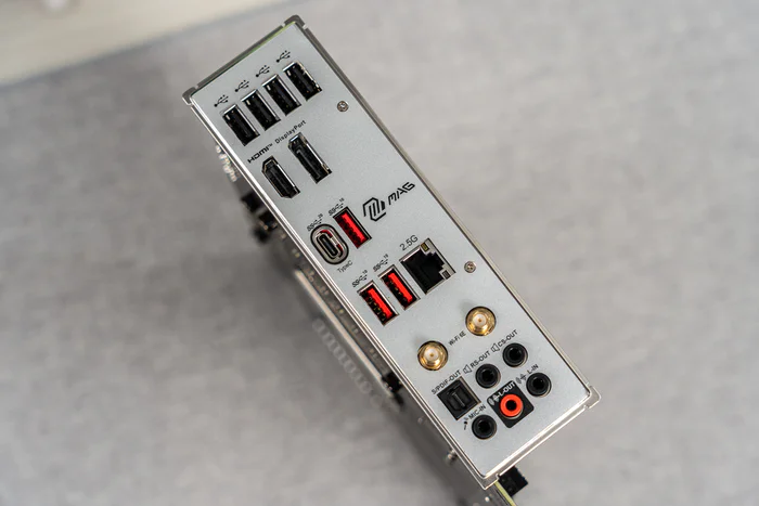 一体式IO护盾背板,接口IO从左至右依次提供了如下接口:4个USB2.0、集显DP和HDMI口、1个20Gbps的USB3.2 GEN 2X2 Type-C口、3个10Gbps的USB3.2 GEN2 Type-A口、2.5G有线接口、WIFI6E接口以及7.1声道音频接口