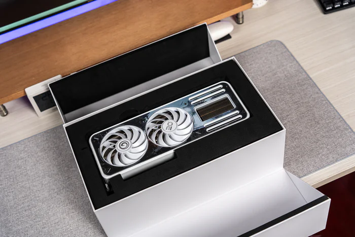 接下来打开包装,内部的显卡盒子则是双边打开式设计,非常有仪式感,中间则是显卡本体,另外这里是双层设计,底下是配件层