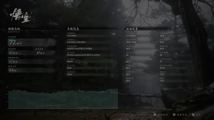 使用游戏自带的BENCHMARK,影驰Geforce RTX 4070 Ti SUPER特别纪念版在4K分辨率下,使用开启帧生成的50%超采样清晰度的DLSS3,在超高画质等级和高级全景光线追踪下测试平均帧率72FPS