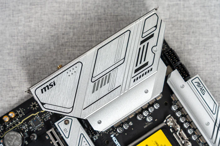厚实的扩展型VRM散热片,配合底部的高性能导热垫可以快速散发其强大供电产生的热量,上面的拉丝效果和MSI的点缀可以说简约即是美