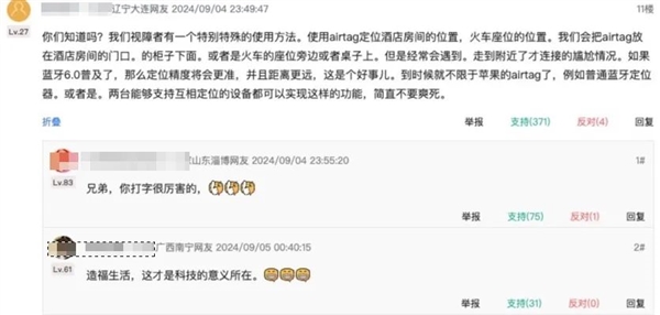 然而最令我沒想到的是,看了評論區才知道,原來蘋果的 AirTag ,對視障人羣而言是個個特殊用法,那就是幫忙定位酒店房間位置、火車座位等等。而藍牙 6.0 要是普及,估計還能給他們帶去不少便利。