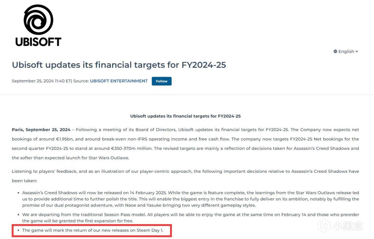 同時,育碧也不再“死鴨子嘴硬”。在最新的“2024-25財年財務目標更新”中,除了提及上述延期內容外,還特意強調“該遊戲標誌着育碧新遊戲在Steam上的迴歸”(The game will mark the return of our new releases on Steam Day 1),這意味着育碧接下來的新遊戲都將Steam首日同步發售。