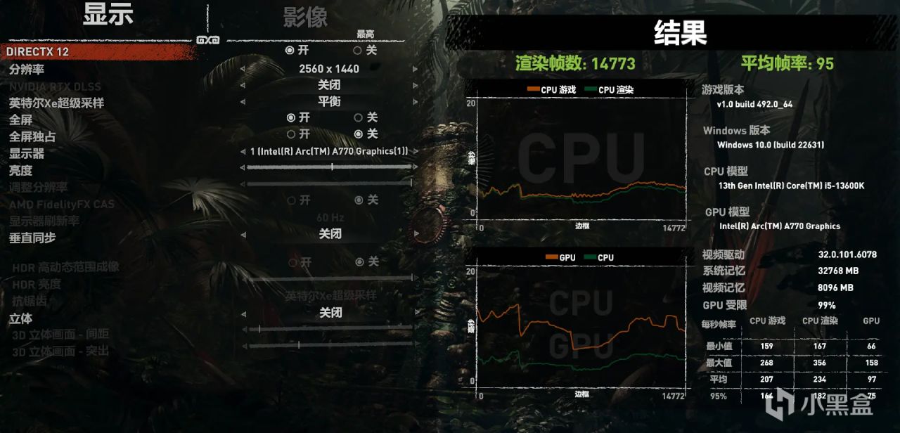 ▲在2K分辨率,预设最高画质,XeSS平衡档时,intel ARC A770可以提供95 FPS的帧率,完全可以称作十分流畅了。