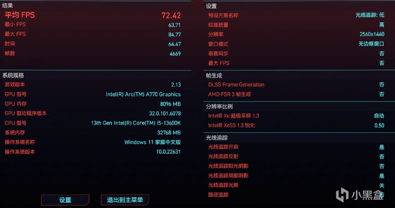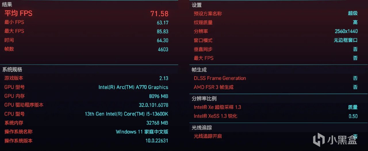 ▲紧接着我们测试《赛博朋克2077》,这款大作不仅支持光线追踪,而且同时支持DLSS、FSR与XeSS 技术,我们这里使用游戏默认的intel显卡超分辨率技术 XeSS。
