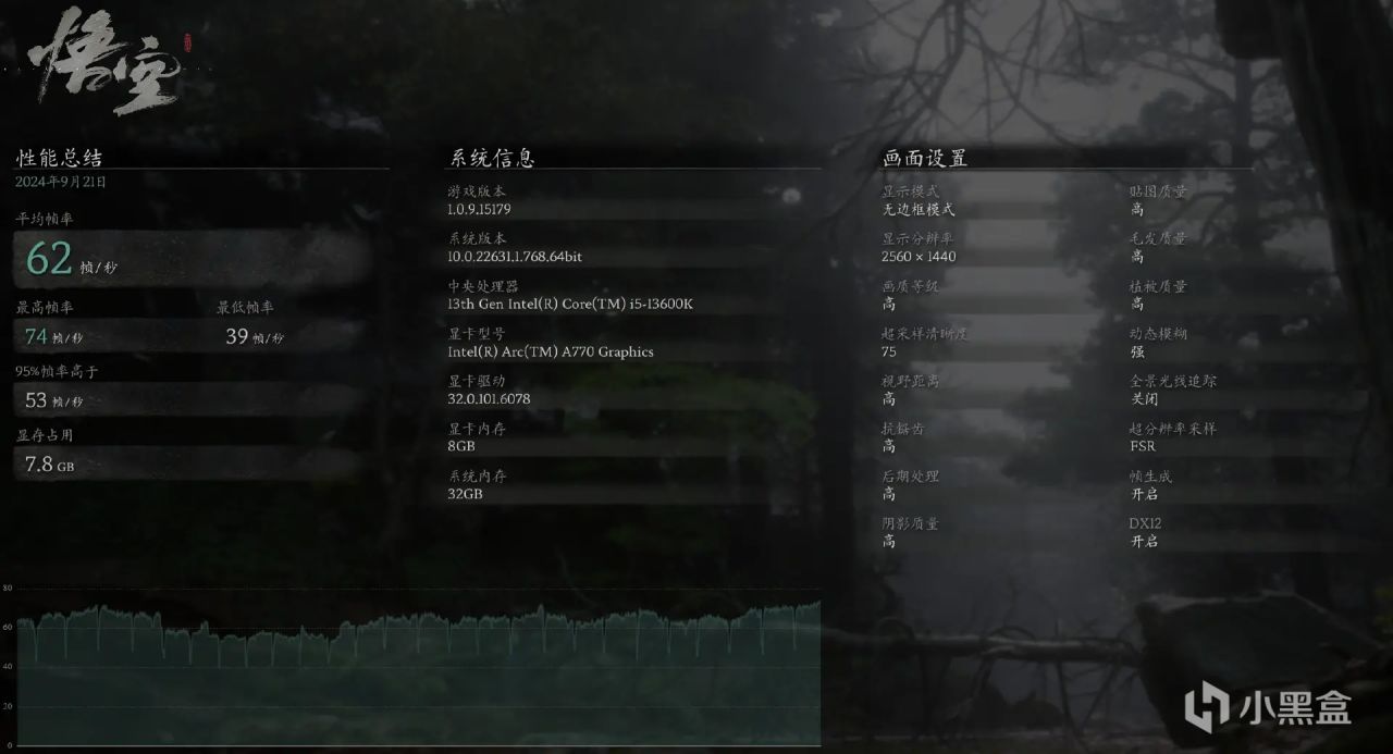 ▲在2K分辨率,游戏推荐配置(画质等级高,光线追踪关闭,FSR帧生成开启时),intel ARC A770 可提供62 FPS的平均帧率,各位黑吗喽可以十分流畅的送猴头了。