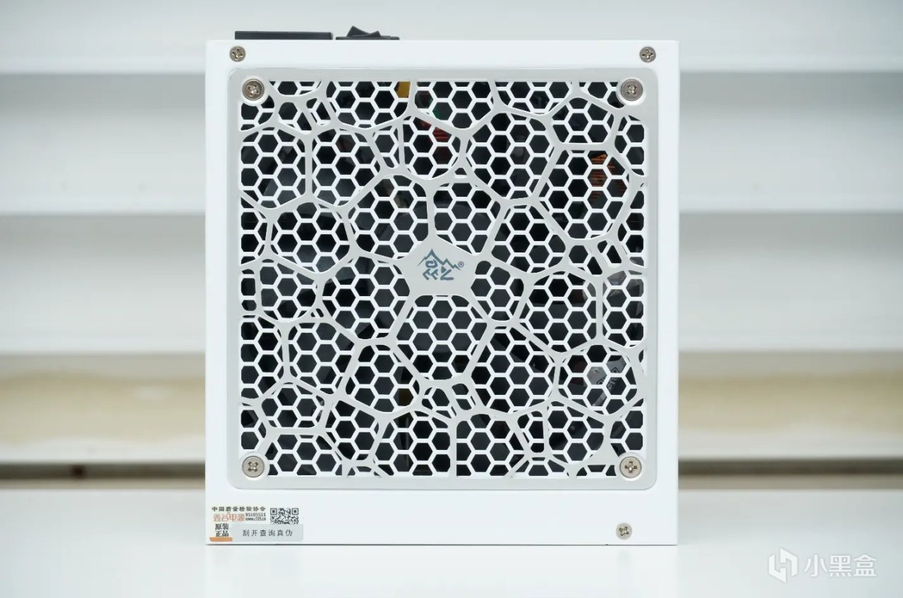 ▲另外,这款电源的配备了135mm FDB轴承风扇,风扇网也很有艺术感,放在开放式机箱中也别有一番风味。