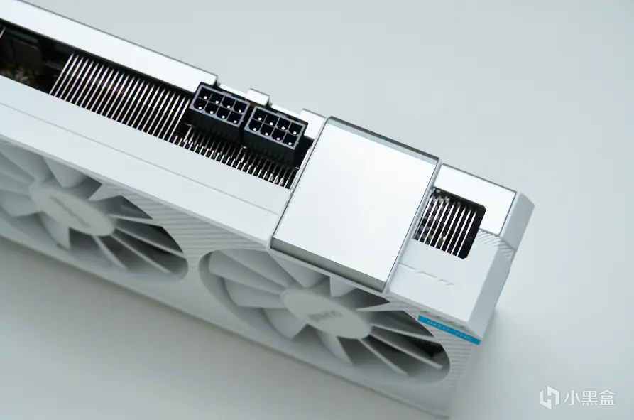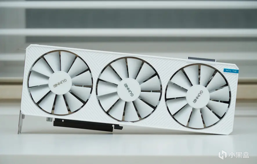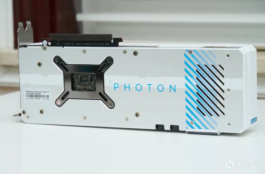 ▲背面则有白色的加固背板,背板上印有显卡系列 PHOTON的蓝色LOGO与装饰条纹,整体仍遵循着Less is More的简洁美学。