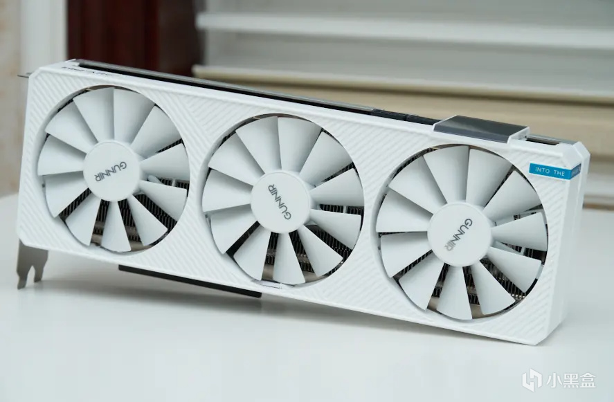 ▲蓝戟 intel ARC A770 PHOTON正面为干净利落的纯白色,看上去毫不花俏,十分适合放在小清新的纯白色主题装机中,显卡采用三风扇设计,长300mm,宽128.5mm。