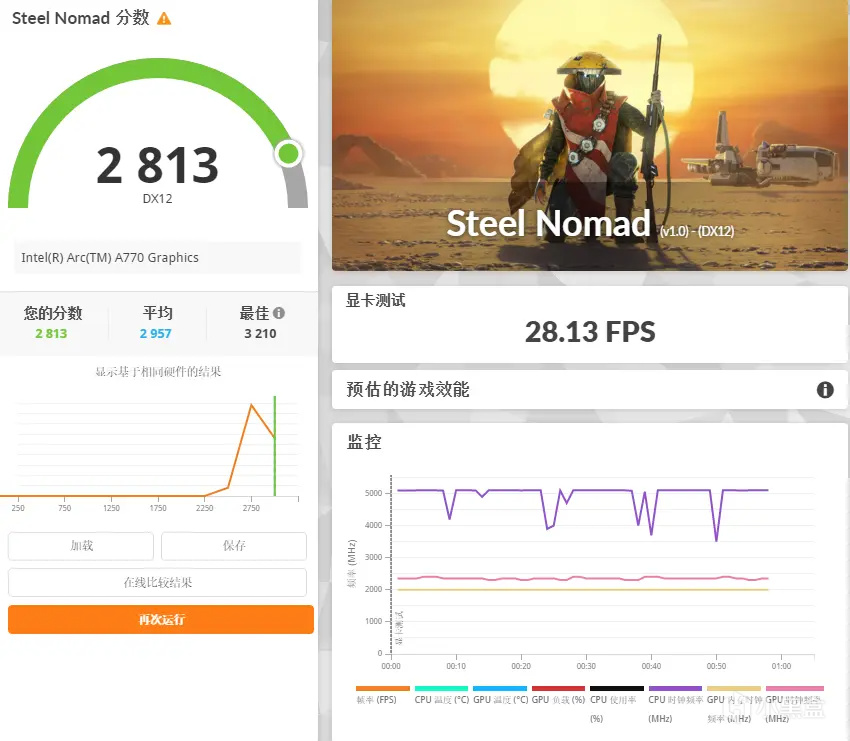 ▲经实测,蓝戟 intel ARC A770 PHOTON得分2813分,换言之,其原生游戏帧率为28.13 FPS。