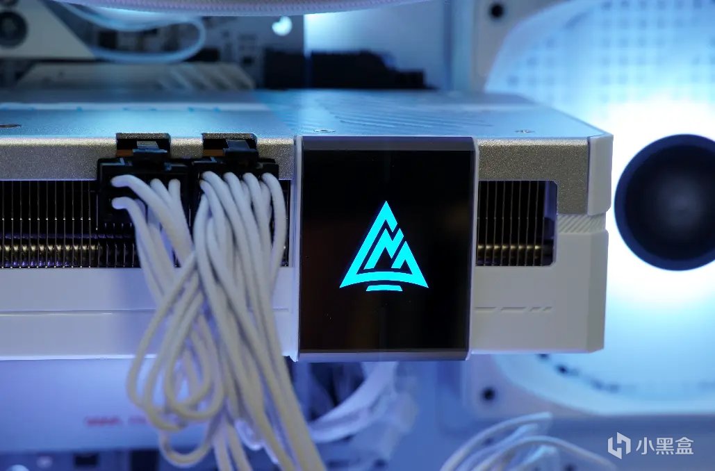 ▲而这个白色镜面,则是蓝戟的LOGO灯,不仅很漂亮,而且还是显卡的一个自检系统灯,蓝色表示正常工作,红灯闪烁为电源异常,黄灯闪烁则为主板PCIe接口异常。