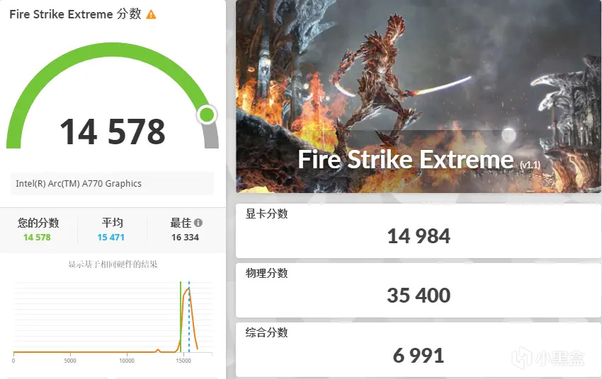 ▲在3D Mark Fire Strike Extreme中,intel ARC A770 的显卡得分为14984分。其中显卡测试1平均帧79 FPS,显卡测试2平均帧率56 FPS,看来,即使面对DX 11的3A大作,intel ARC A770 也能轻松应对。