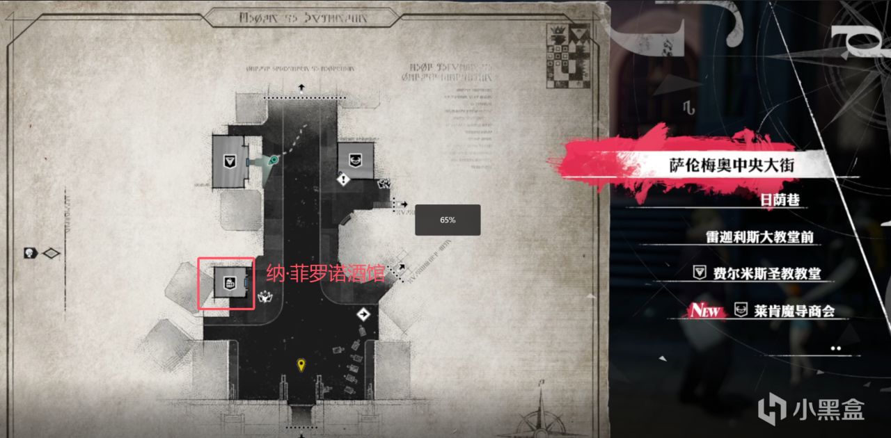 先来看【安心甜甜圈】吧,这个需要我们在王城的时候前往【萨伦梅奥中央大街】,然后在前往地图左下角的【酒馆“纳·斐罗诺”】进去。这里给大家直接贴出对应的地图,游戏里面打开地图就可以直接进行传送。