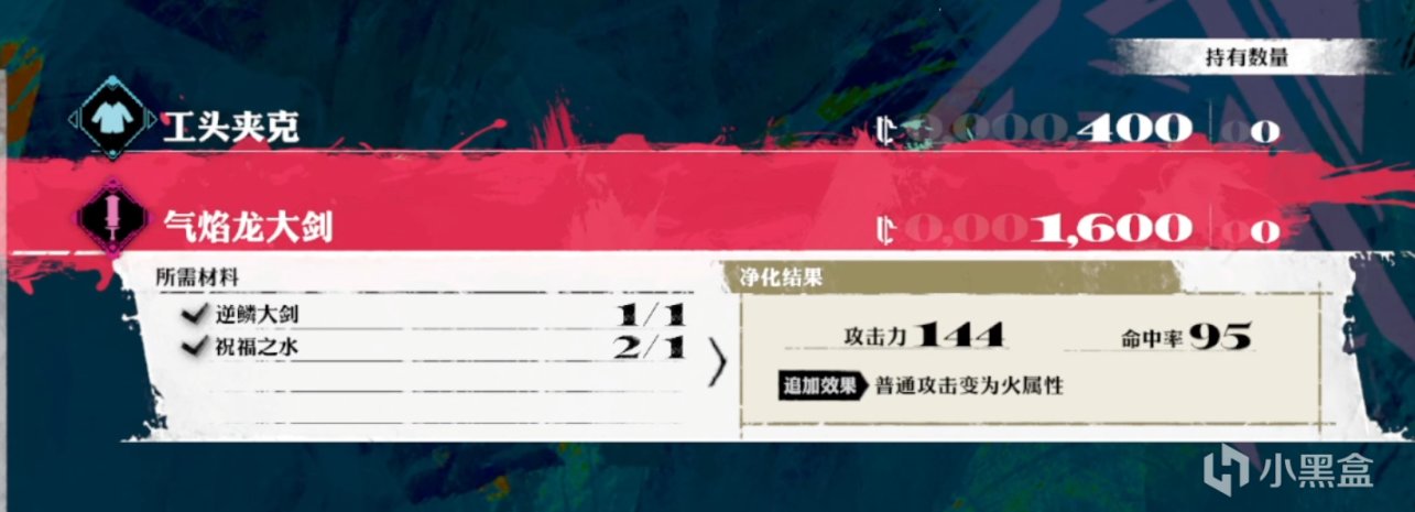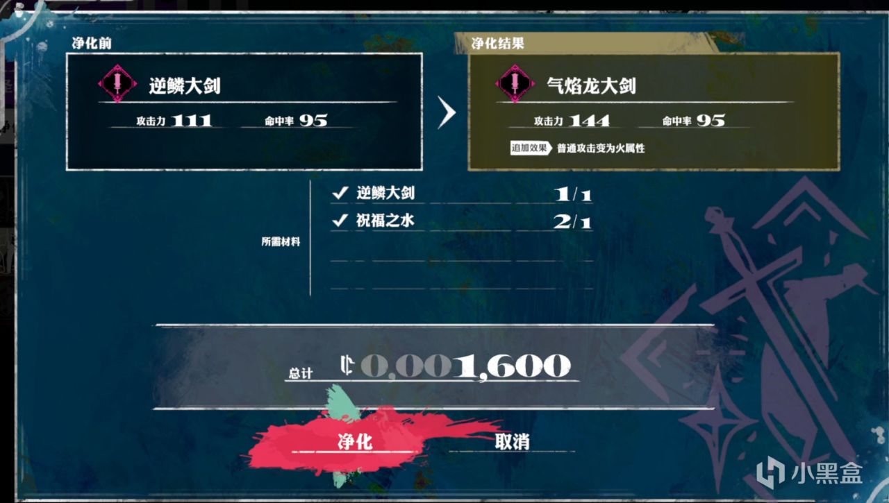 点开【净化】之后就能够看到我们目前可以净化的装备,其实相当于就是一个强化附魔,但是只有特定的武器才可以。这里可以看到我们之前拿到的【逆鳞大剑】就可以强化成【气焰龙大剑】,只需要我们拥有1600的钱和一瓶祝福之水即可合成,可以说是十分简单的条件了,但是面板强了不少!
