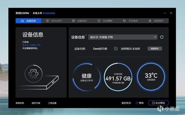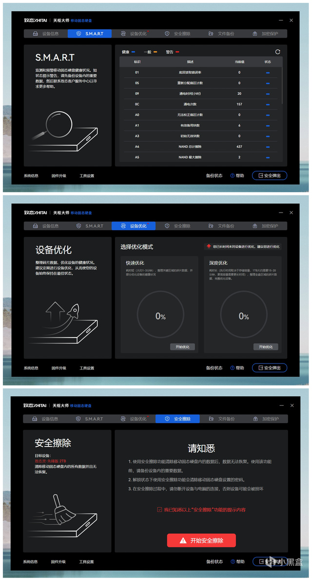在基本的加密功能外,官方还提供了一个「致态天枢大师」的 PC 端管理工具,可以对硬盘的状态信息进行管理,比如已用空间、设备温度、设备健康等。同时还可以对硬盘进行快速/深度优化,或者安全擦除,比如硬盘要出二手或者借给别人使用时,就可以有效确保删除数据不能被恢复。