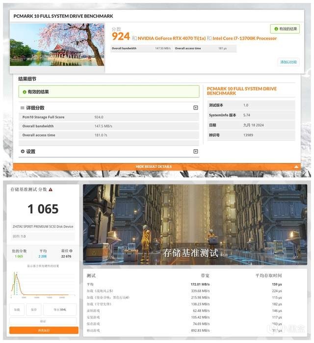 PCMark 10 完整硬盘测试中,获得 924 分,带宽为 147.5MB/s,总存取时间 181.0μs。在 3DMark 硬盘测试中,平均带宽 172.01MB/s,平均存取时间 159μs,基准测试得分 1065 分。