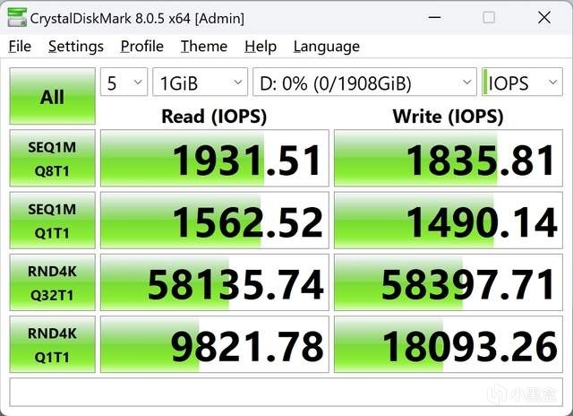 致态灵·先锋版移动固态硬盘的顺序读写次数分别达到 1931.51 IOPS 和 1835.81 IOPS。4K 随机读取次数为 9821.78 IOPS,随机写入次数为 18093.26 IOPS。其中 RND4K Q32T1 随机读取次数为 581135.74 IOPS,随机写入次数为 58397.71 IOPS。