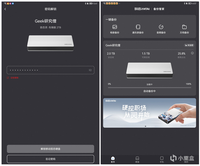 但致态显然非常重视移动固态硬盘的【安全属性】,不仅在硬盘内部预设了 256 位的 AES 加密软件,可以为硬盘设置密钥,并且可以在特定计算机上自动解锁。而且在移动端安排了「致态备份管家」,可以为用户提供跨端的数据加密备份功能。