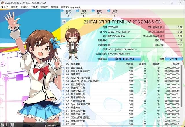 通过 CrystalDiskInfo查看,可以看到致态灵·先锋版移动固态硬盘的接口通道是 UASP,采用 ACS-2 / ATA8-ACS version 4c 标准,支持S.M.A.R.T.、NCQ、TRIM 功能。固件版本为 ZTB50001,写入和读取数据都是 0GB,健康状况良好,温度 29℃。