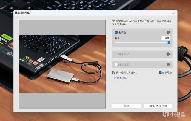 同时后期处理起来读写相当吃读写,特别是去噪点和导出时,都堪称“时间消失术”,有了 PSSD 后,可以在一定程度上减少耗时,提升工作的效率,可以看到 44 张图片的批量去杂色耗时仅为 17 分钟。