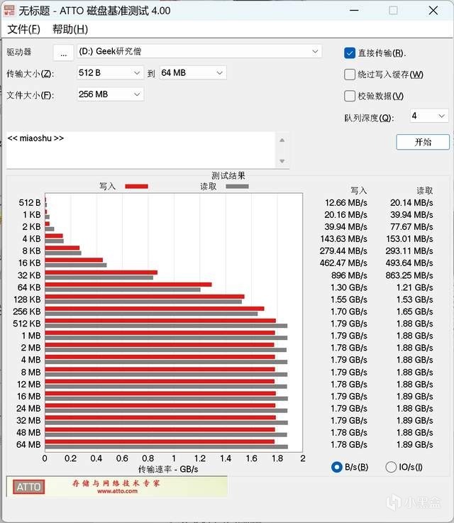第一项测试的是 ATTO 磁盘基准,可以看到最大的顺序写入速率在 1.79GB/s,最大顺序读取速率在 1.89 GB/s。