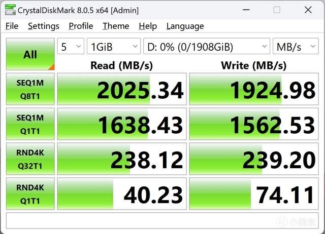 CrystalDiskMark 测试中,致态灵·先锋版移动固态硬盘的顺序读取速度达到 1924.98MB/s,顺序写入速度为 2025.34MB/s。4K 随机读取速度为 74.11MB/s,随机写入速度为 40.23MB/s。其中 RND4K Q32T16 随机读速为 238.12MB/s,随机写速为 239.90MB/s。