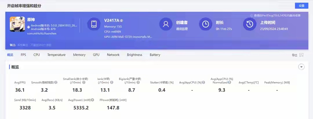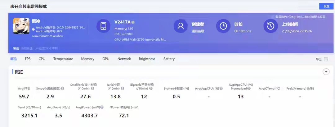 需要說一下,PerfDog 的幀率線條只會檢測到遊戲原生的幀率表現,而 iQOO Z9 Turbo+的提升幀率策略是將原生 60 幀畫面降低至 36 幀,再通過插幀的方式提升至 72 幀,因此沒有辦法記錄插幀的表現。