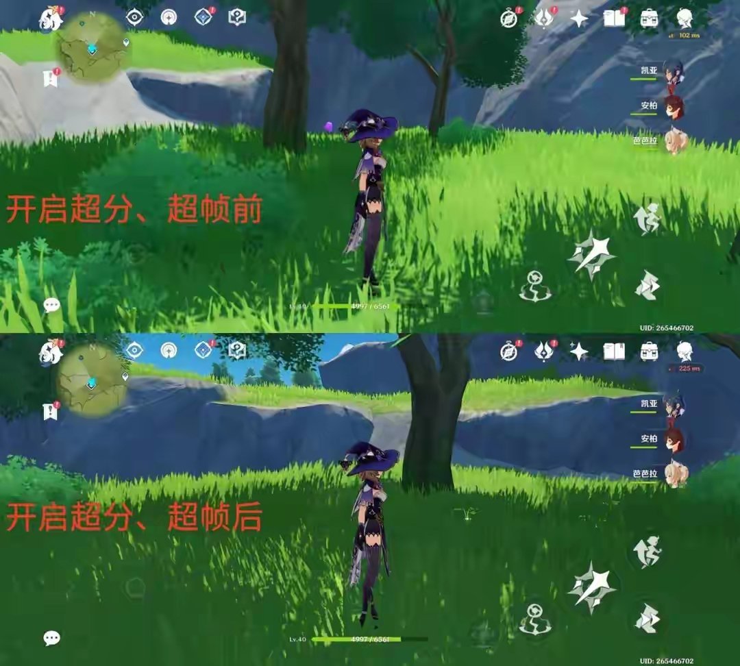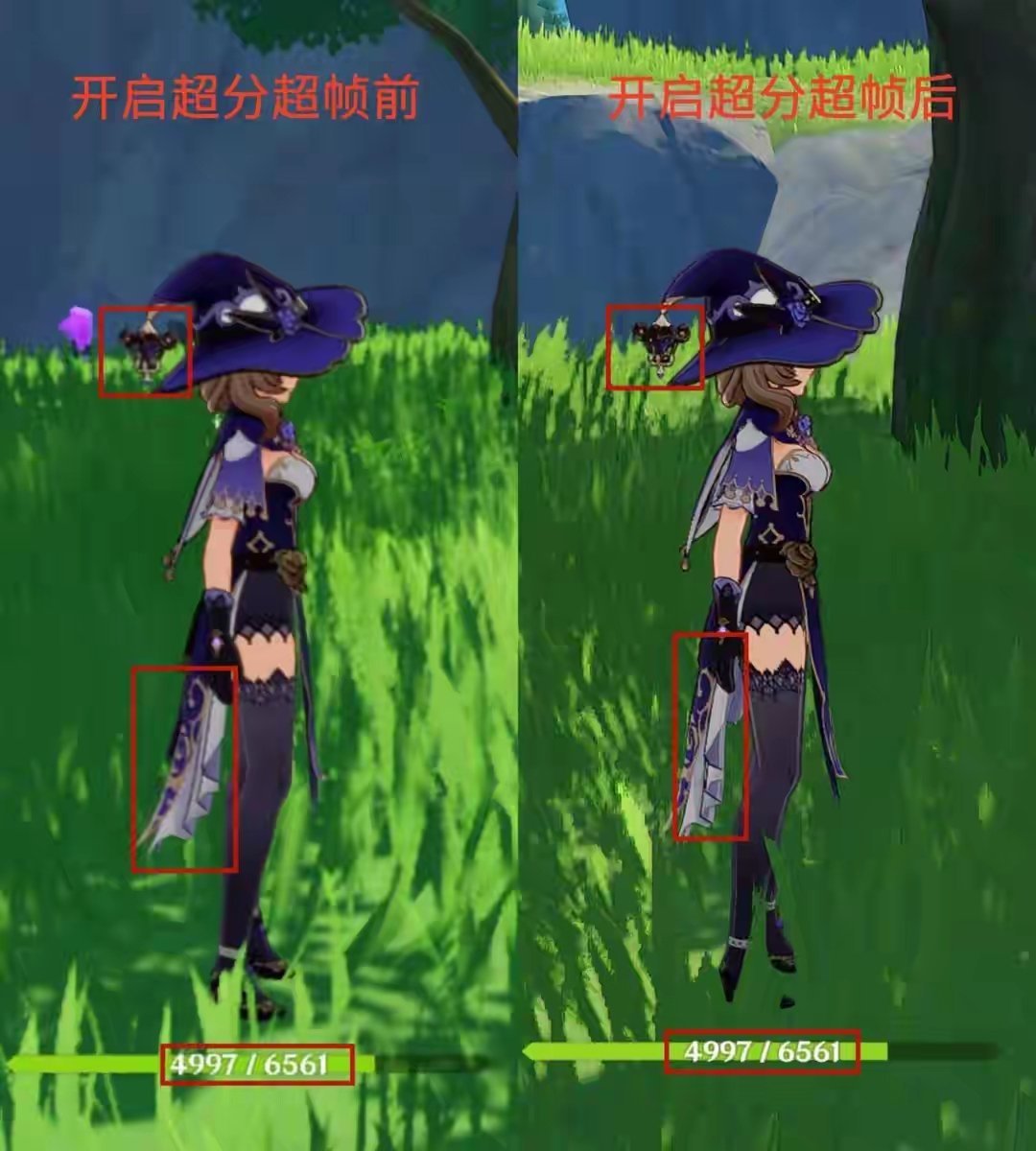 iQOO Z9 Turbo+在開啓超分超幀的情況下相較於沒有開啓超分超幀時,功耗和機身溫度會略高一點,但整體與原生畫質幀率下的相關表現幾乎相同。稍稍提高一點點功耗就能體驗到超高清超流暢的遊戲畫面,這顆電競芯片 Q1 可以說是有很大增益。下圖是筆者在遊戲中畫面截圖的一個對比:開啓超分後,畫面清晰度提升很大,細節更加豐富。對於日常遊戲的使用體驗改善挺大的,體驗過了就有種回不去的感覺。
