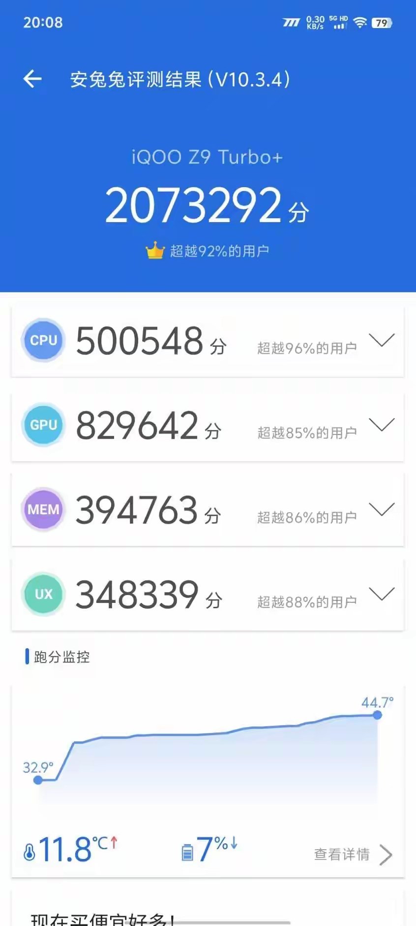 跑分結果:2073292分,跑分期間溫度升高11.8℃,電池電量下降7%,分數很高,尤其是CPU分數特別強悍,對於日常使用還是遊戲使用,性能支撐得非常到位。