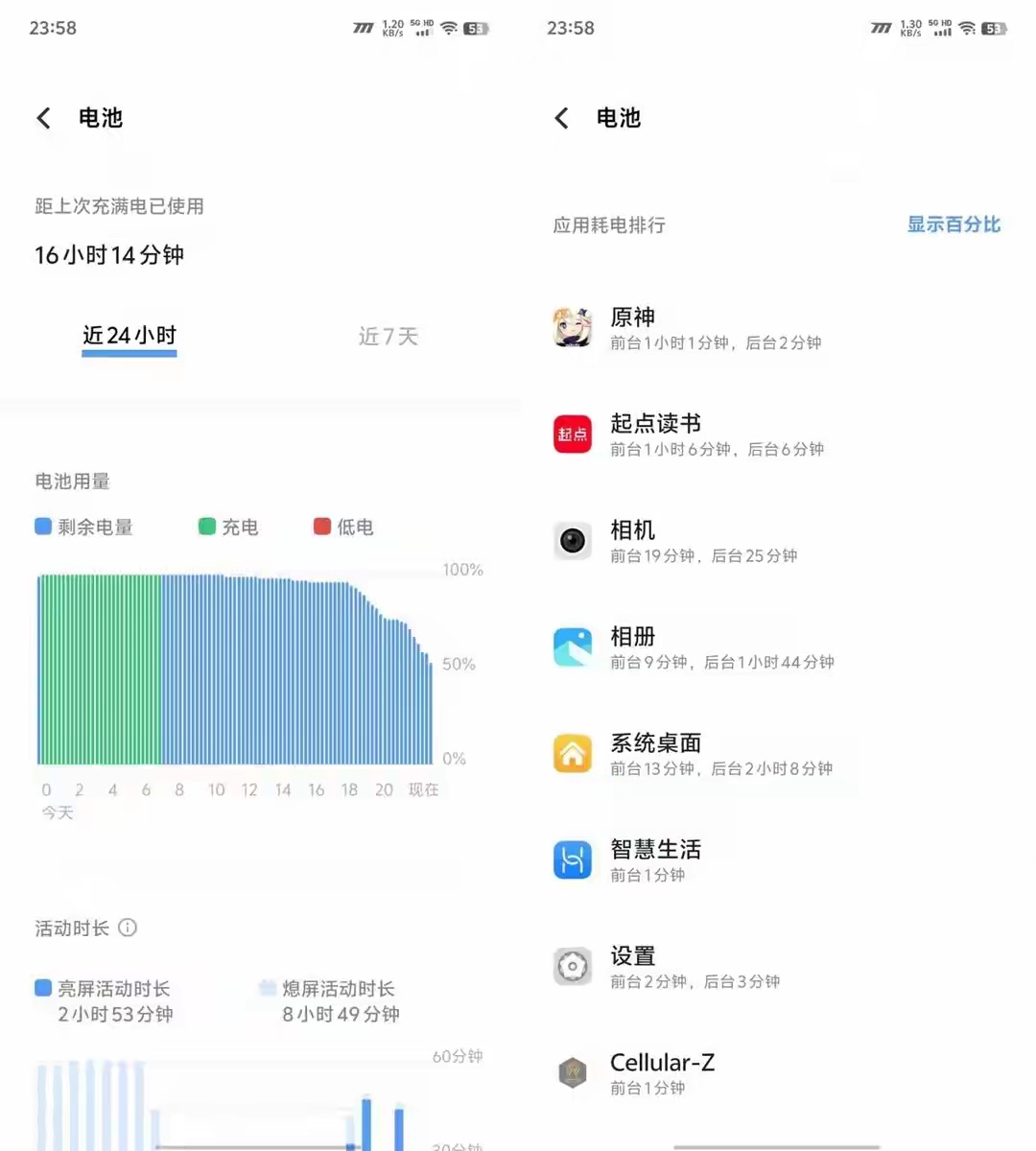 超級耐用!比如筆者最近一天的使用情況(Monster模式、50%亮度、超清屏幕分辨率、高刷新率)是:充滿電一共用了16個小時多的情況下,亮屏2小時53分鐘、原神1個小時(WiFi)、看小說1個多小時(5G)、相機19分鐘等。然後電量還剩下53%,用得是真的很安心。