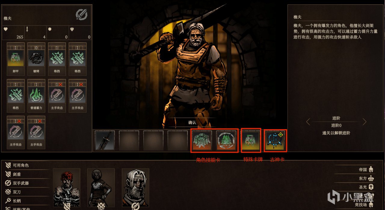 游戏ea版本目前一共六个角色,demo有两个角色,每个角色携带不同的武器,有不同的技能和卡牌。角色还会有单独的机制,比如樵夫可以切换姿态,不同姿态下卡牌会有不同效果