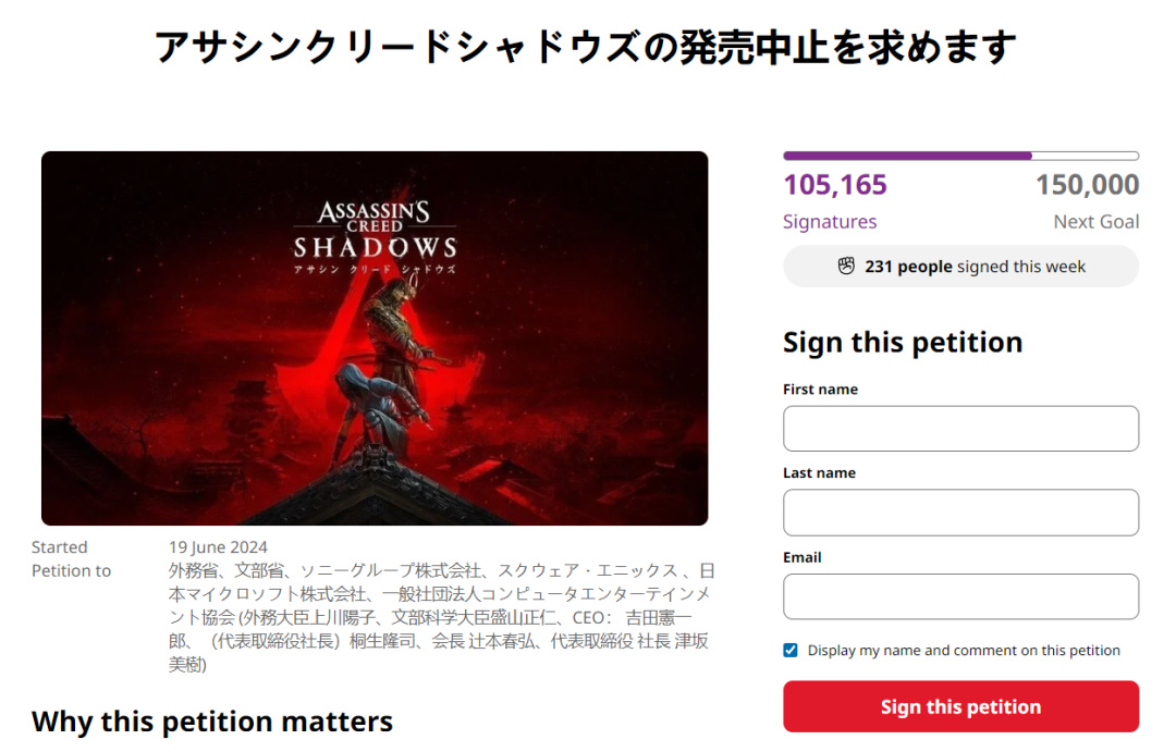 請願網站Change.org上有超過10萬名日本玩家簽署請願書,要求育碧停止開發《刺客信條:影》,還把事件上報給了日本政府,試圖召喚官方力量封殺遊戲,可見怨念之深。