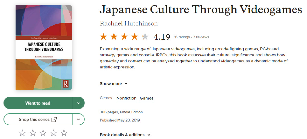 2020年,蕾切爾出版了著作《通過電子遊戲讀懂日本文化》(Japanese Culture Through Videogames),在書評網站Goodreads上評分頗高。