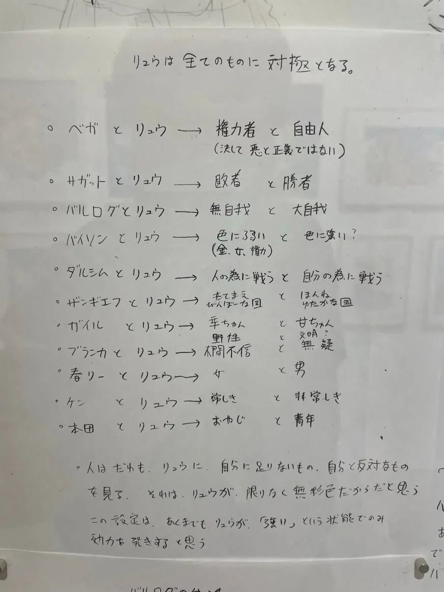 還有網友拿出了自己拍攝的《街霸》開發手稿,設定資料顯示,作爲看板人物的隆和每個角色都存在一定的對立關係。比如維嘉是“擁有權利的人”,隆是“嚮往自由的人”;達爾西姆是“爲他人而戰”,隆是“爲自己而戰”;巴爾洛克“沒有自我意識”,而隆是“自我意識強烈的人”。