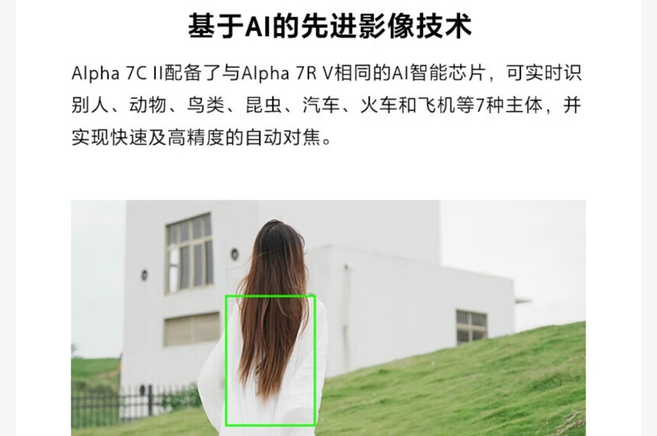 A7C2内置了AI智能芯片,可以自动识别和追踪多达7种拍摄主体,包括人、动物、鸟类等,并且提升了对焦的精度和速度。对于技巧差一些的人来说是提成成片率的一个重要因素。