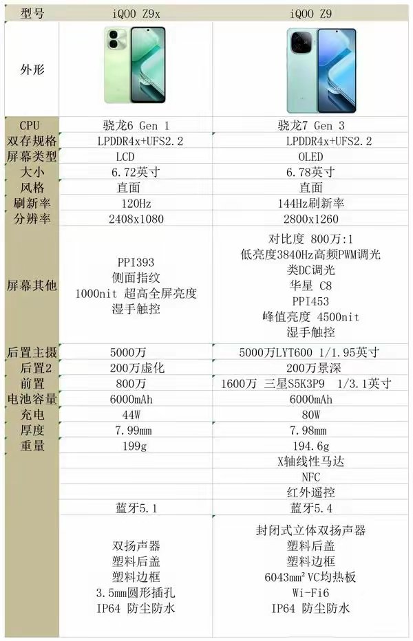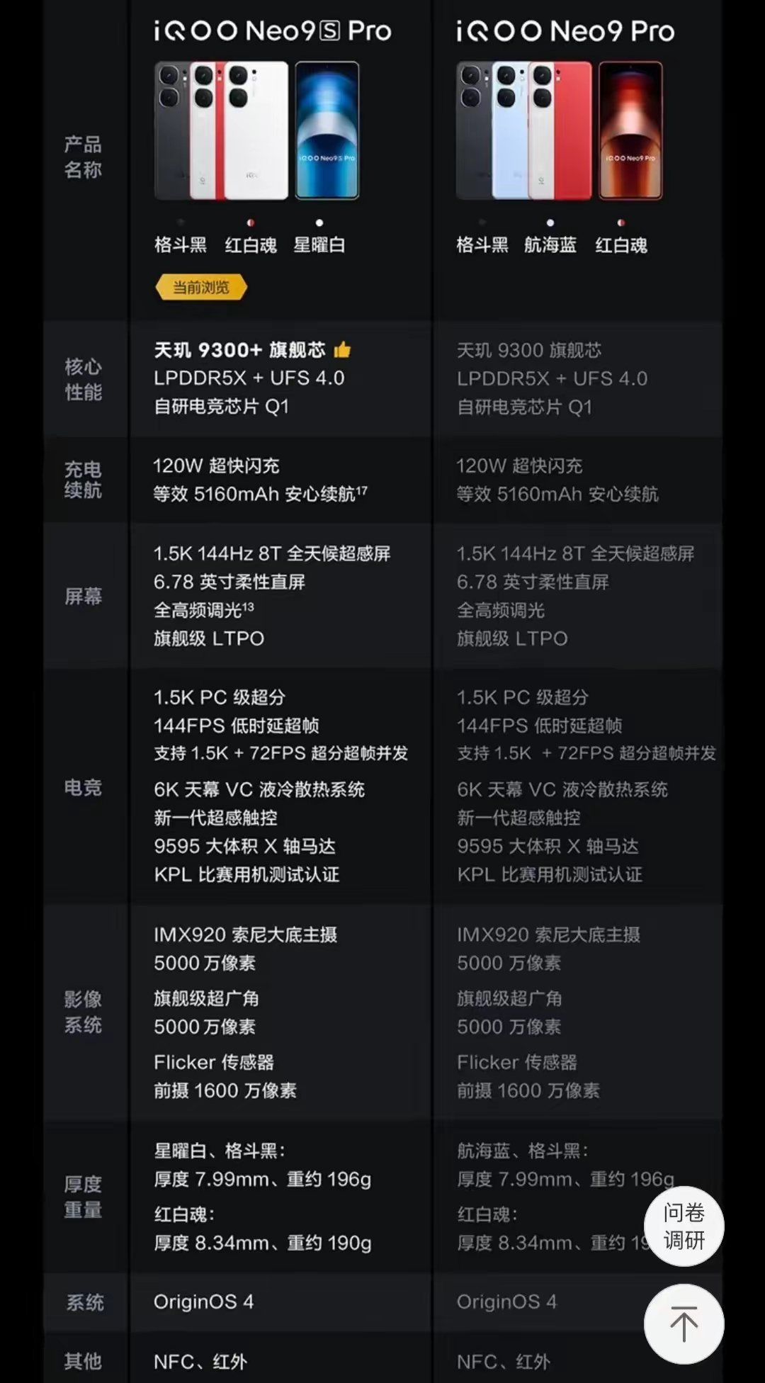 最后就是iQOOneo9Pro和iQOOneo9sPro了,说实话这两部手机配置几乎一模一样,只不过是说sPro的处理器天玑9300后面多了一个“+”,性能有一点点挤牙膏的提升吧,甚至是定价也一模一样,感觉就是做出来恶心neo9Pro机主