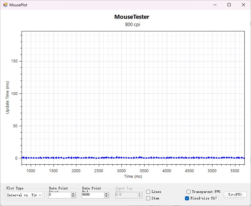 前面我們說過GPW4鷹眼採用了目前市面上一騎絕塵的8000Hz輪詢率,配合超低延遲的LIGHTSPEED無線技術,在MouseTester的延遲測試中也取得了非常不錯的成績,我們先快速移動鼠標,再看到間隔曲線幾乎貼合在座標軸的0上,這說明鼠標在高速移動中接近0延遲並且沒有卡頓或丟幀的情況,8000Hz接收器+LIGHTSPEED可以說雙管齊下,杜絕鼠標卡頓丟幀的毛病!