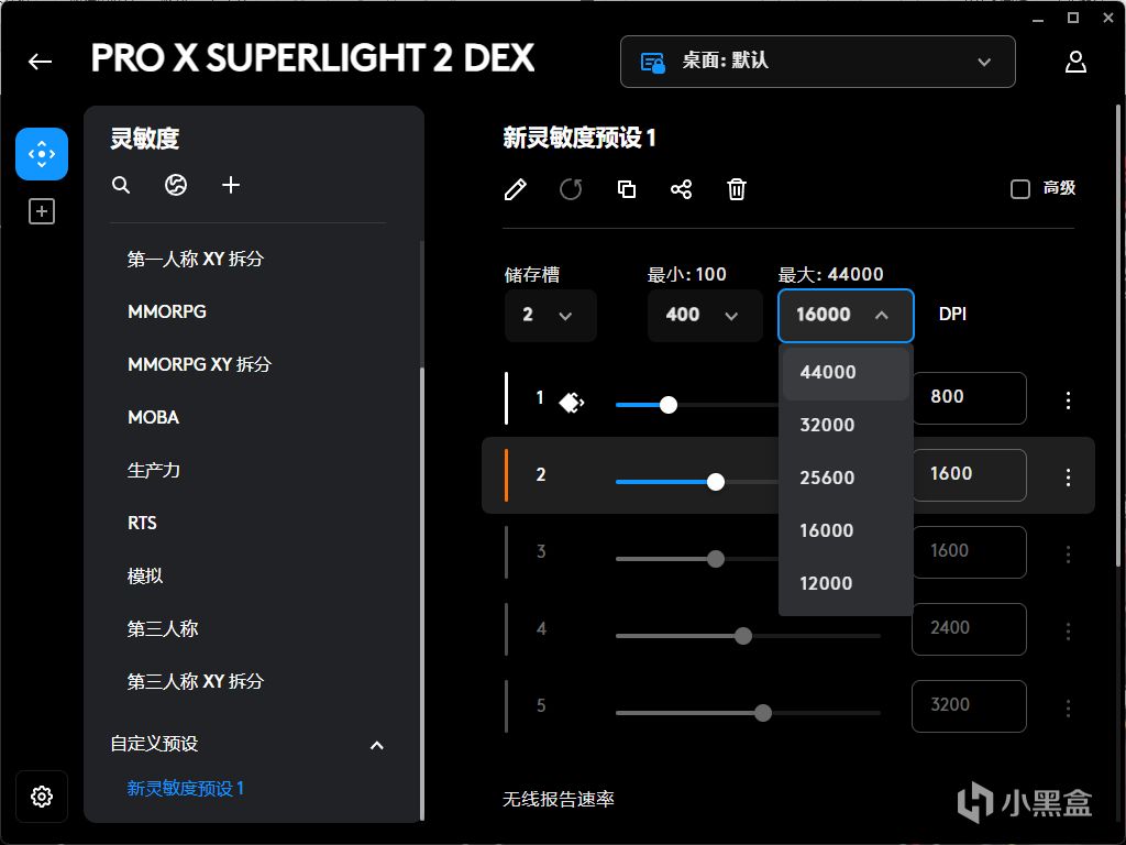 在羅技專屬驅動G HUB中,我們看到在DPI設置一欄裏,最大的DPI可以調節到44000,傳感器的最大DPI數值越大,也就代表着鼠標傳感器的精準度越高,如此誇張的性能離不開HERO 2引擎的強大性能水準支持。