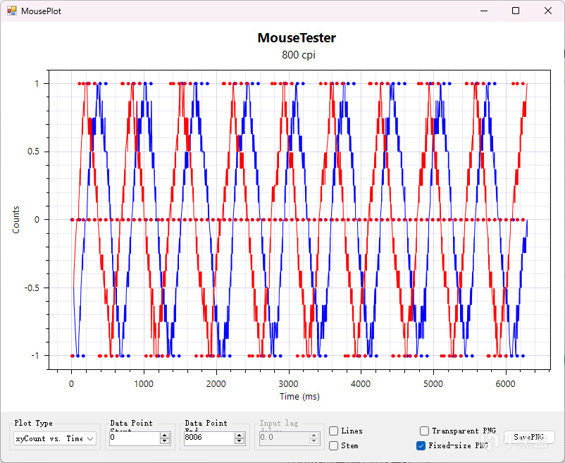 觀察MouseTester的捕捉工具我們發現,GPW4鷹眼在移動鼠標的過程中,XY軸的偏移曲線上下極爲平滑,兩條曲線近乎相同,這說明GPW4鷹眼在精準度方面做到了極高的水準,幾乎看不到鼠標偏移丟幀的現象,在精確度上遙遙領先。